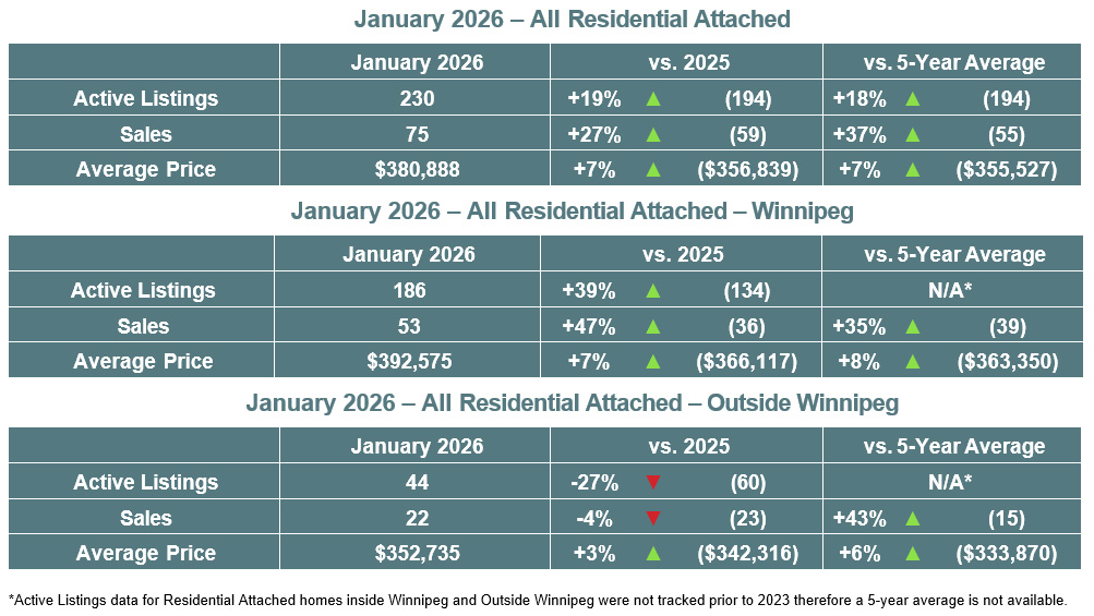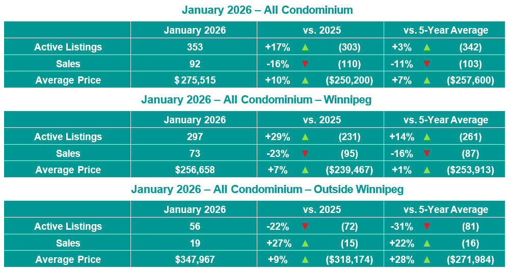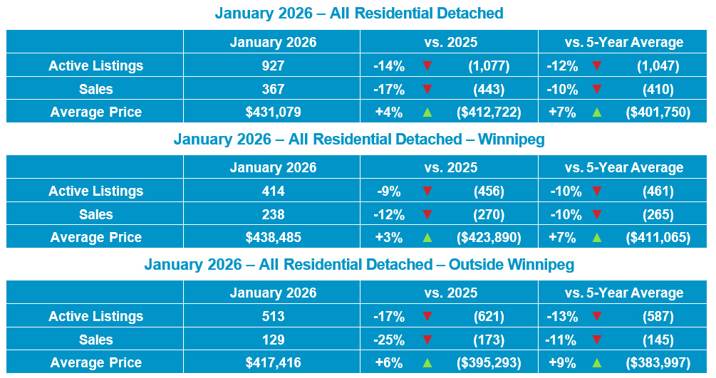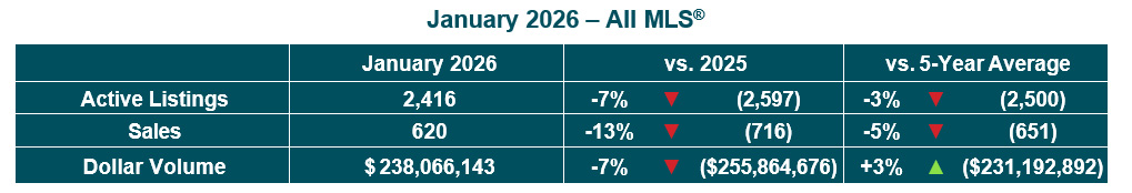 Winnipeg, February 5, 2026 – All MLS® sales, active listings and dollar volume in January 2026 were below January 2025 while only dollar volume rose above the 5-year average. Residential detached MLS® sales, active listings and dollar volume were below last year and the 5-year average while average prices were above last year and the 5-year average. Condominium MLS® sales and dollar volume were below January 2025 and the 5-year average. Condominium active listings and average prices rose above last year and the 5-year average.